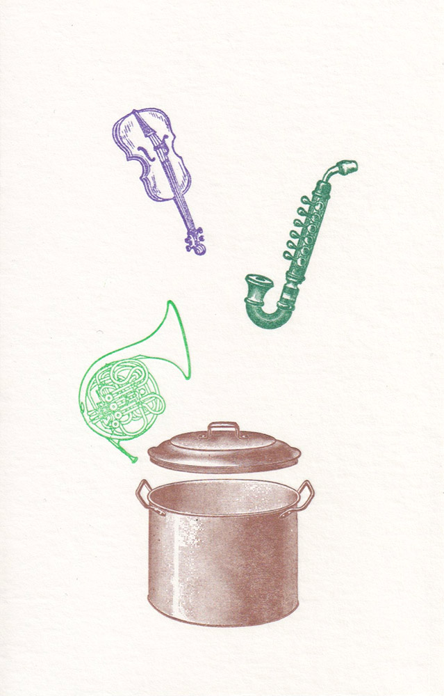 Vierfarbiger Buckdruck von alten Klischees (der Topf ist von ca. 1880, das Horn von ca. 1960). Das merkwürdige, einer Klarinette ähnliche Instrument könnte ein Bassetthorn sein.