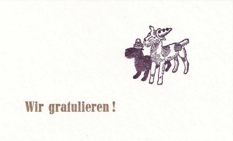 Mit Hütchen geschmückt kommen diese beiden – etwas struppigen – Hündchen zur Gratulation. Die Hunde sind in dunklem Violett, die Schrift darunter (gesetzt aus der Sparta) ist goldfarben gedruckt.