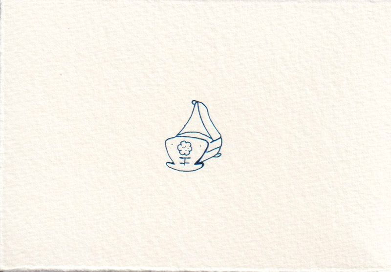 Kleine Karte mit einer zierlichen Wiege in blau-metallic, eingeprägt in das Büttenpapier mit Heißfolienprägung.