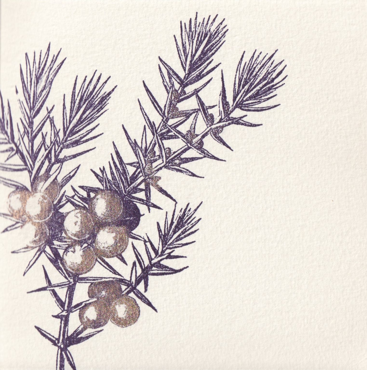 Ein Wacholderzweig in dunklem Violett mit golden schimmernden Beeren für festliche Grüße im Winter.