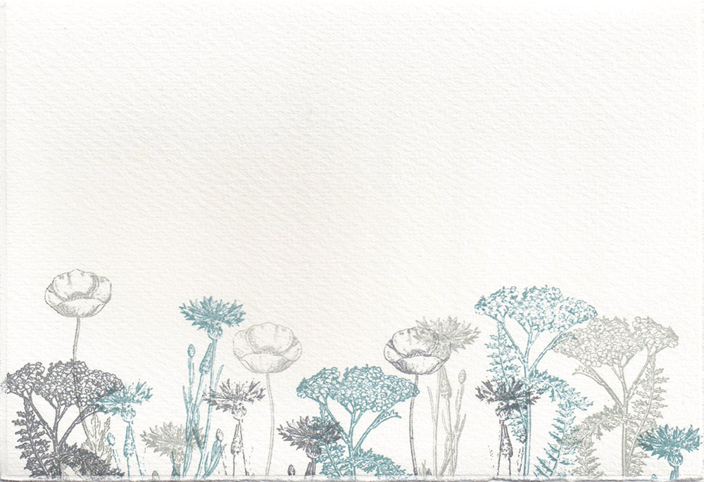 Eine sommerliche Wiese in zarten Blau- und Grautönen.
