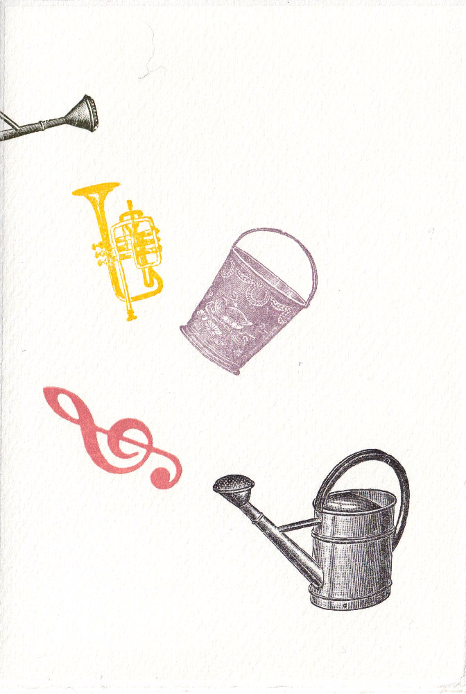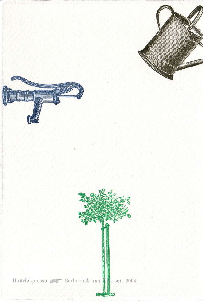 Diese Karte gehört eindeutig zu den kurioseren Karten der Umtriebpresse: was da alles aus den alten Giesskannen kommt! Und auf der Rückseite gibts auch eine Wasserpumpe. Als Händel-Fan ist für mich „Wassermusik“ der passende Titel, aber da gibt es mit Sicherheit noch einige andere Ideen.