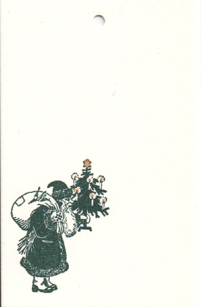 Kleine Geschenk-Anhänger mit einem Weihnachtsmann, gedruckt in dunkelgrün und von Hand koloriert.